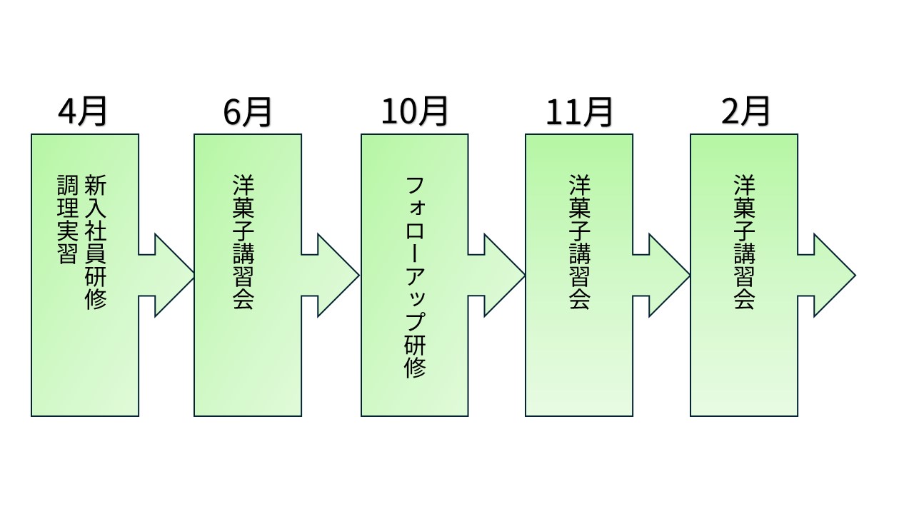 各事業所から従業員が集い、顧客満足度の向上、衛生管理、スチコン活用法など、毎回テーマを決め、研修を行っております。